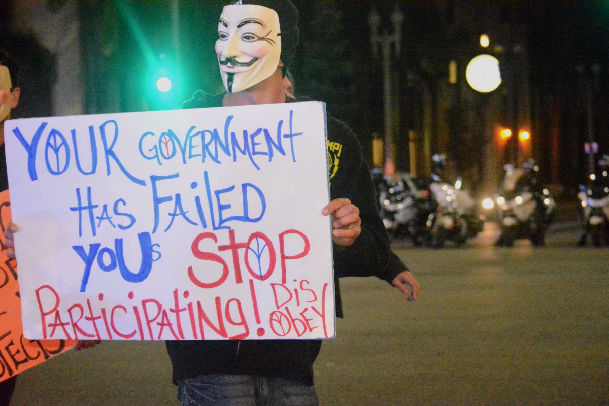 Ferguson 5 Published November 25, 2014 at 6000 × 4000 in Ferguson Protests in Los Angeles- 11/24 ← Previous Next → Dawning the infamous Guy Fawkes mask, one protestor holds up a sign that reads, ‘Your government has failed you. Stop participating!’